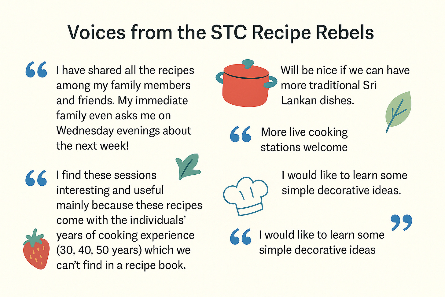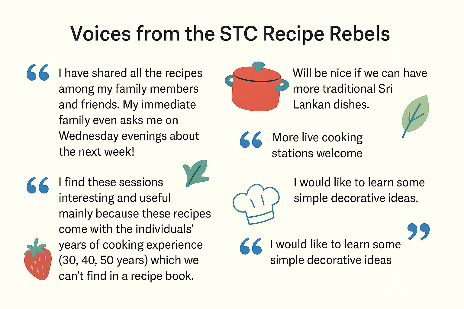 Each week, the STC Recipe Rebels dive into a colorful world of culinary exploration, bringing together time-honored traditions and bold new Flavours. The sessions are a true celebration of food and fellowship, where hearty soups are described in rich detail, refreshing salads are reimagined with local twists, and rice dishes are inspired with layers of spice and texture. From nostalgic baked treats to festive favorites, every gathering is a feast for the imagination.